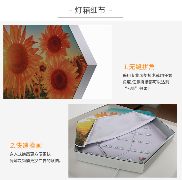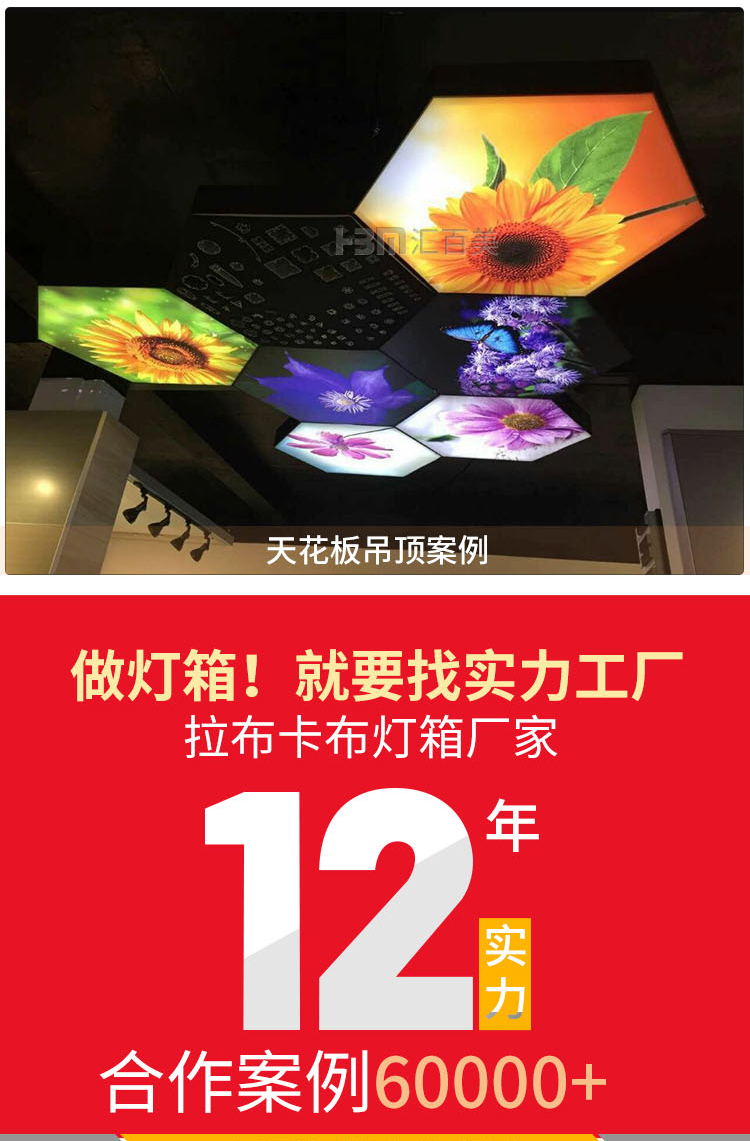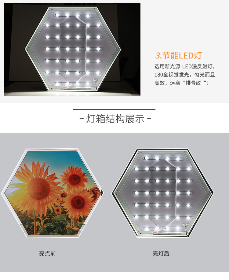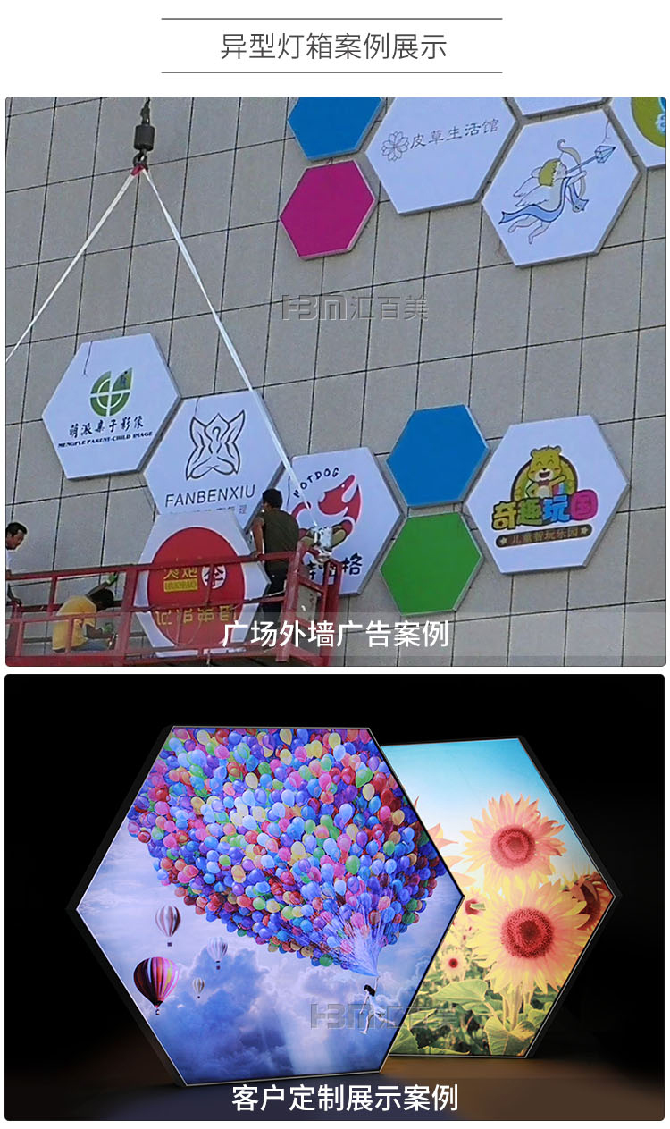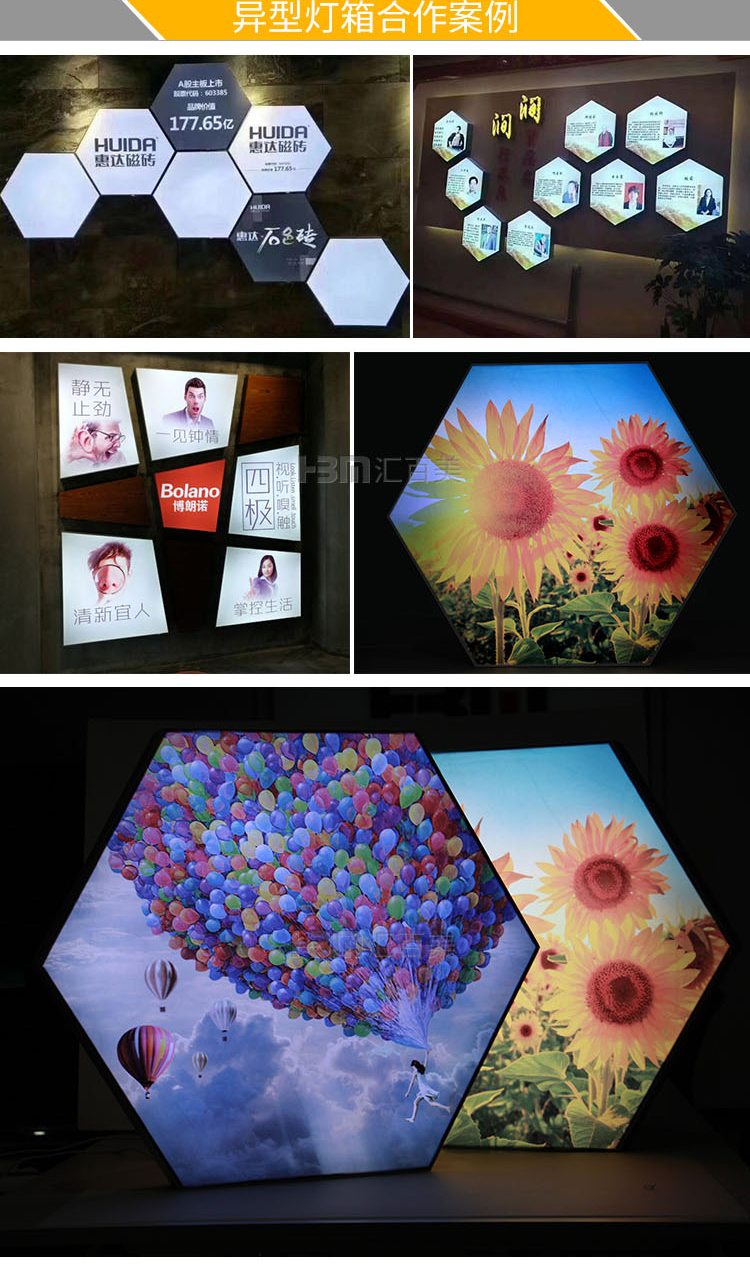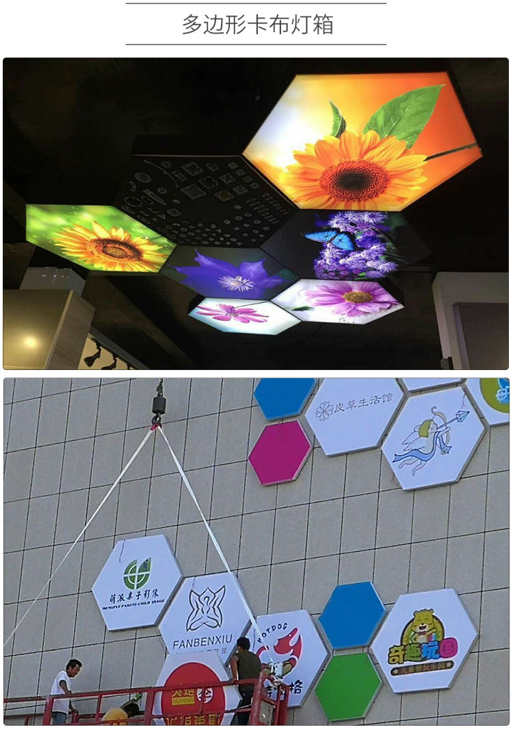 產(chǎn)品簡介:六邊形軟膜卡布燈箱,創(chuàng)新的燈箱廣告讓您的廣告更獨(dú)特引人注目,非常展示創(chuàng)意性的品牌形象,可以拼接多種造型,帶來異樣的廣告效果...
