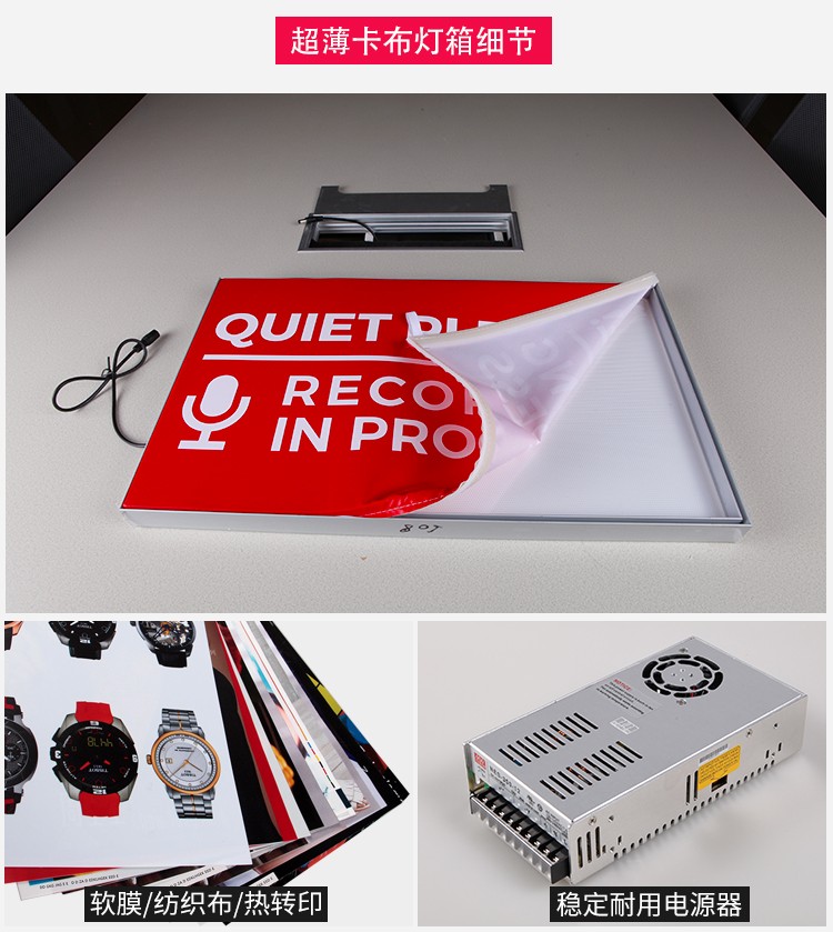 產(chǎn)品簡介:4分超薄卡布燈箱,經(jīng)典的超薄無框鋁型材設(shè)計(jì),光源可根據(jù)需求選擇導(dǎo)光板或漫反射背光源,常用于服裝/飾品/奶茶/餐廳等店面廣告宣傳,讓整個(gè)店鋪彰顯出高貴與奢華、高調(diào)與端莊。...