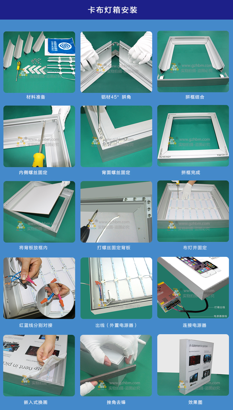 那么卡布燈箱的制作過程就如我上述所說,大家是不是覺得很簡單呢,其實也沒你們想的那么復雜了,如果還有不懂的,請看下面圖解,相信有圖有真相的面前,一目了然了吧~