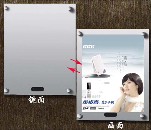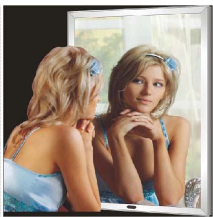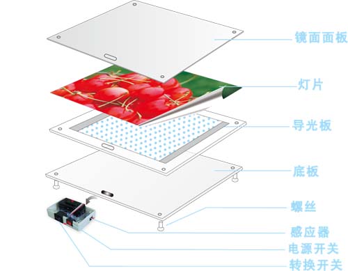 感應(yīng)燈箱的制作跟水晶燈箱類似,主要區(qū)別是此款燈箱的面板采用的是半透鏡的面板,而且在燈箱內(nèi)安裝了一個感應(yīng)器,所以感應(yīng)燈箱的結(jié)構(gòu)(如下圖)也有所不同感應(yīng)器燈箱的主要性能是可以以兩種形態(tài)存在(人在時鏡子,人遠離時是廣告畫面).