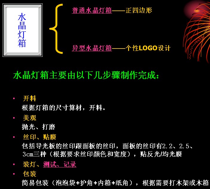 包括導(dǎo)光板的絲印跟面板的絲印,面板的絲印有2.2、2.5、3cm三種(根據(jù)要求絲印顏色和寬度),貼反光/均光膜