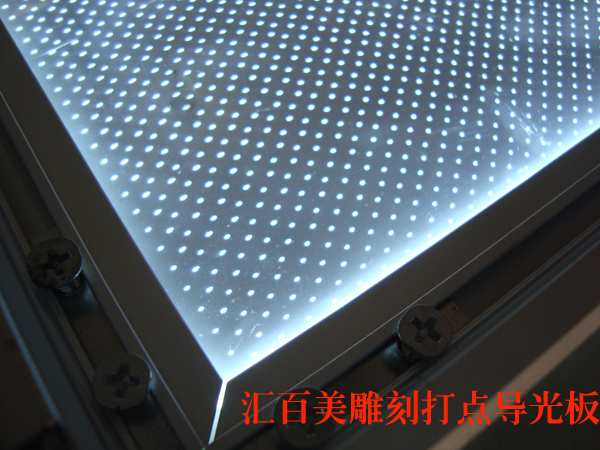 雕刻導光板:雕刻導光板分為劃線導光板和激光打點兩種,劃線是指在亞克力板上通過激光機劃出一條條線槽,而打點是通過特定的激光技術打出一個個凹孔點陣的形式,讓光線在側面打光時折射出來,形成一種聚光勻光的作用。這個目前可以將光源轉化的最好的一種。但是雕刻導光板工藝復雜,耗時長,因而也相對比較貴些,目前一些對亮度要求特別高的用戶可以采用此種工藝來做超薄燈箱。超薄燈箱廠家