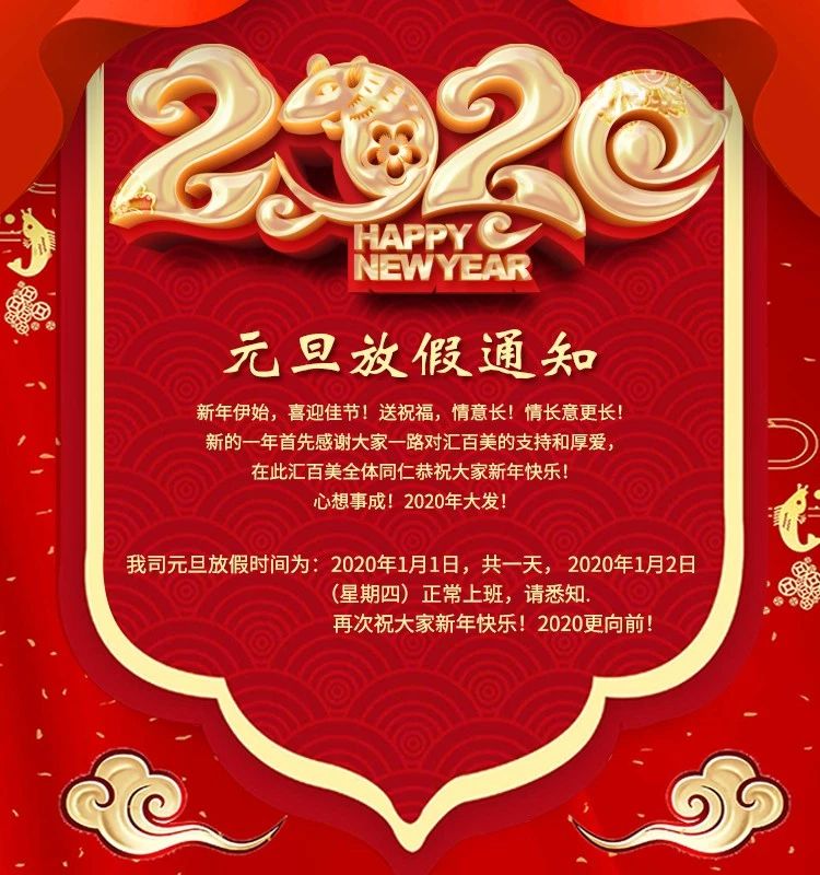 新年伊始,喜迎佳節(jié)!送祝福,情意長(zhǎng)!情長(zhǎng)意更長(zhǎng)!新的一年首先再感謝大家一路對(duì)匯百美的支持和厚愛(ài),在此匯百美全體同仁恭祝大家新年快樂(lè)!心想事成!2020年大發(fā)!