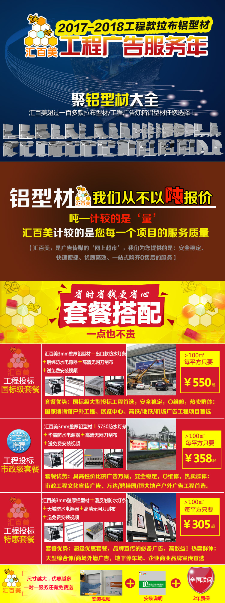 匯百美燈箱鋁材生產(chǎn)廠家,專注拉布燈箱、燈箱鋁型材研發(fā)生產(chǎn)銷售十年,我們從不以“噸”報價,是因為我們可以為客戶提供快速高效、高性價比的一站式服務(wù),直接為客戶解決問題,出貨快!質(zhì)量好!O售后!也正是因為這樣,我們承接的大型工程項目越來越多,目前已經(jīng)積累了包括長隆、萬達、碧桂園、古馳、南方電網(wǎng)、中國電信、迪奧、豐田等的數(shù)十萬拉布燈箱案例方案,我們的價格雖然沒有“噸”的優(yōu)勢,但是我們提供的是一站式的“網(wǎng)上超市”服務(wù),您在這里可以一站購齊,我們還為您提供有效的解決方案,所以如果一定要說“貴”,那我們就“貴“在品質(zhì),“貴”在售后,“貴”在為您承擔(dān)太多。